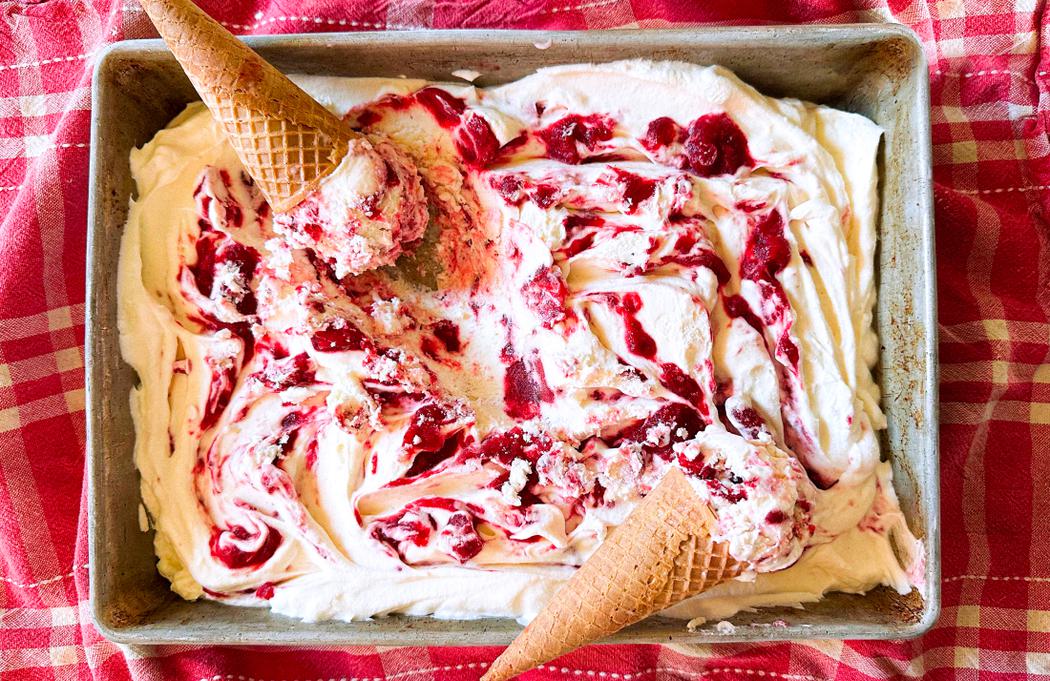 Pour a third of the ice cream mixture into a freezer-safe container. Dot one third of the fruit mixture over the ice cream; swirl with through with utensil. Repeat layering process twice more. Cover with foil and freeze for at least 12 hours, preferably overnight.