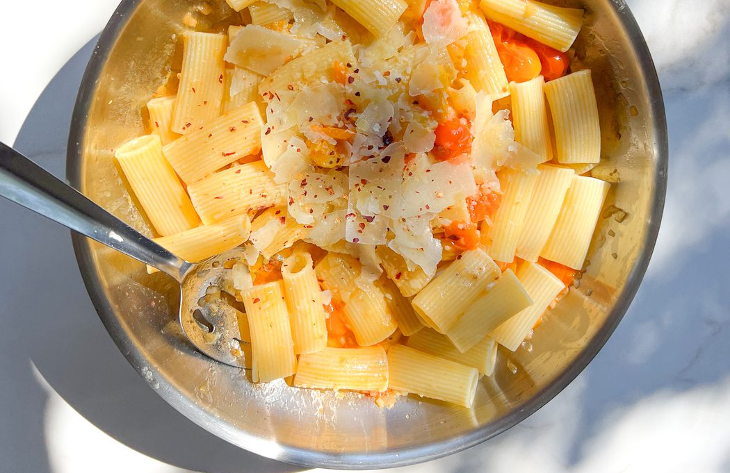 While the tomatoes are cooking, cook the pasta according to package instructions. Before straining, reserve 1/2 cup of pasta water in case you need to thin out the pasta sauce.
