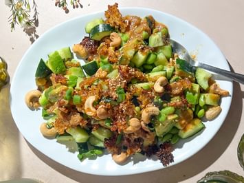 In the mood for a cold entree but bored with the usual torn lettuce? Try our Crispy Rice Salad, featuring cucumber and edamame, topped with rice fried to the perfect crunch (tip: use leftover rice that’s been sitting in the fridge!), and the peanut sauce you will make again and again.