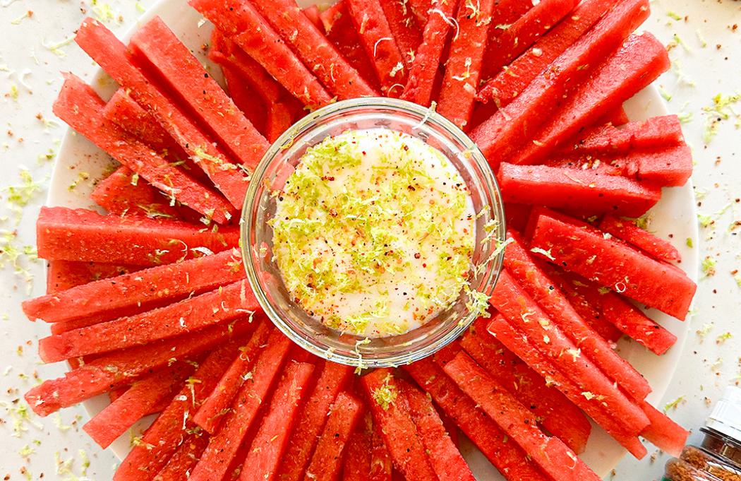 Plate the watermelon fries, sprinkle on the remaining tajin and zest, and serve with the dip.
